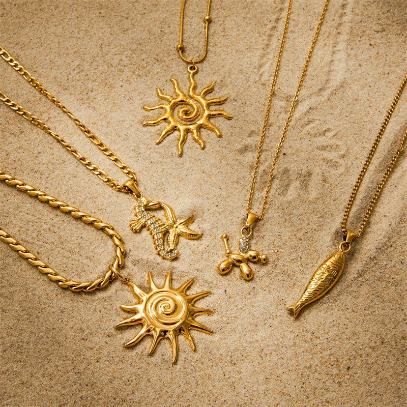 Length: Sun necklace with beaded chain 40+5cm, Sun necklace with chunky chain 38.5+5cm, Fish necklace 42+5cm